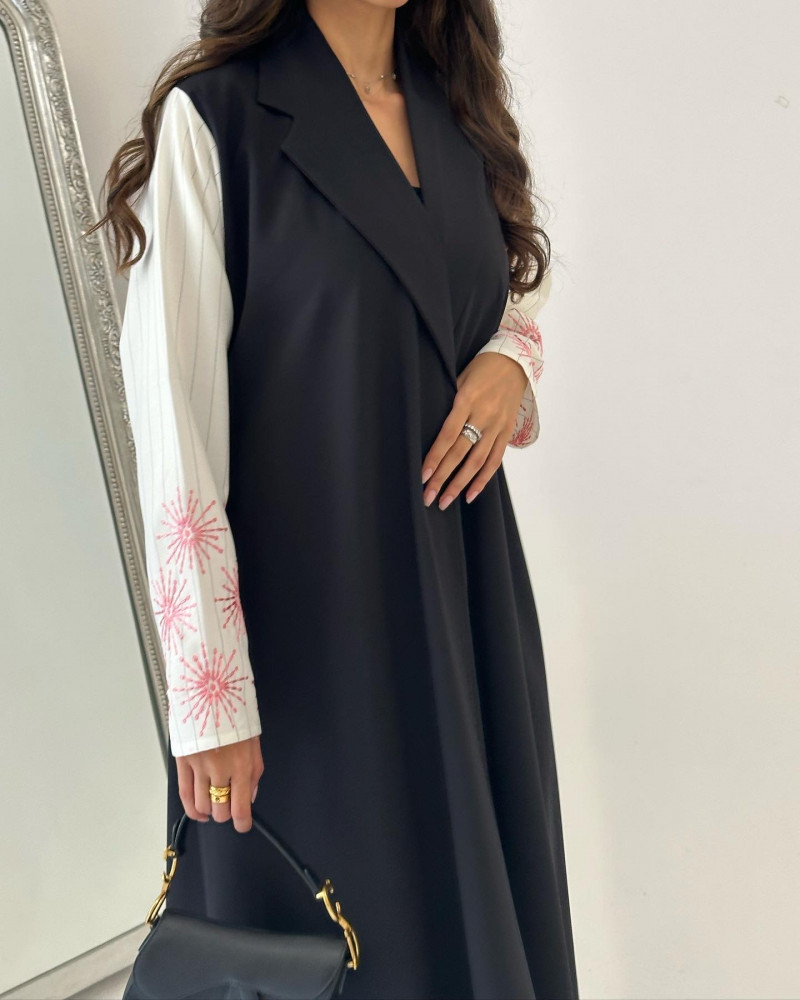 الاكمام كتان مقلم ابيض مع تطريز يدوي